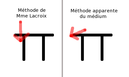 Sa technique n’était donc pas efficace du tout et ne correspondait pas à la méthode suggérée ici pour expliquer comment le médium pourrait faire basculer la table. Pour mieux comprendre la différence entre la force appliquée par le médium et celle appliquée par Mme Lacroix, j’ai fait un schéma simple, que j’ai mis ici en bas.