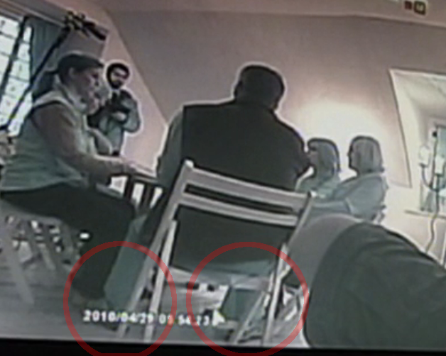 On y voit le médium appliquer ses pieds sur les pattes de la table. (Source: émission «Rencontres paranormales» du 1er décembre sur la chaîne TVA.)
