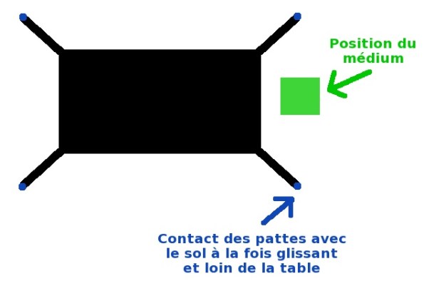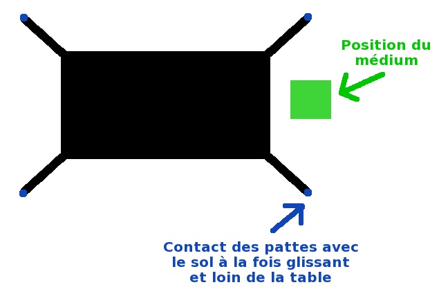 Le dessus de la table habituellement utilisée par le médium est placé sur le sol ou sur un meuble difficile à soulever. Faire bouger seulement le dessus est suffisant.