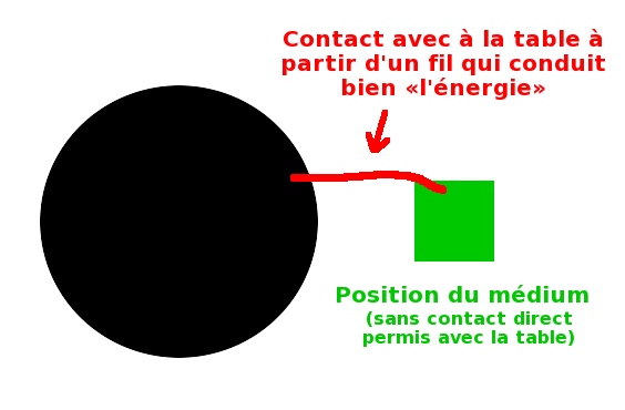 Si le médium veut utiliser sa table, il sera possible de le faire de différentes façons. La façon suggérée ici consiste à créer un contact avec la table par des fils conducteur, sans créer un contact directe des mains avec la table. Ainsi, si «l’énergie» circule vraiment dans le métal pour permettre aux entités de faire bouger la table, elle pourra circuler à travers les fils qui le relira à la table. Cette connexion est utilisée dans le but de s’assurer qu’aucun principe de levier ne puisse être utilisé. Ainsi, la façon de disposer les fils doit faire en sorte que personne ne touche à la table directement et que du même coup les fils ne peuvent pas être utilisés directement pour la faire basculer.