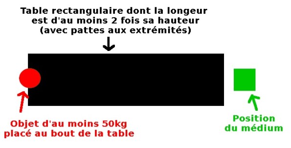 La dernière expérience suggérée consiste à utiliser une longue table rectangulaire dont les pattes sont positionnées aux extrémités (comme la table dans la séance de la maison Trestler) avec un objet lourd à l’extrémité opposée au médium. La longueur de la table doit être d’au moins 2 fois sa hauteur et la masse de l’objet doit être d’au moins 50kg. De cette façon, on s’assure que la table ne peut pas être basculée grâce au principe de levier puisque le fait que la masse (l’objet de 50kg) soit à l’autre l’extrémité du médium fait en sorte que ceci correspondrait pour ledit médium à soulever une masse d’environ 100kg. Dans cette situation, le médium peut appuyer ses pieds sur les pattes de la table et placer ses mains où il les place habituellement. L’utilisation d’une seule main rendrait l’expérience encore plus concluante. Dans ce cas, il faudra que la table bascule du côté du médium, ou sinon il faudra que la masse soit changée de côté (ou que deux masses identiques soient placées de chaque côté).